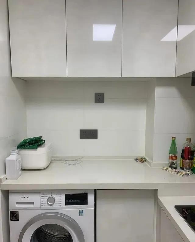 鉴于空间有限,定制橱柜时特意在旁边预留了放置洗衣机的位置,这样做并没有带来任何不便。将洗衣机放在这里使用,洗衣过程十分便捷。